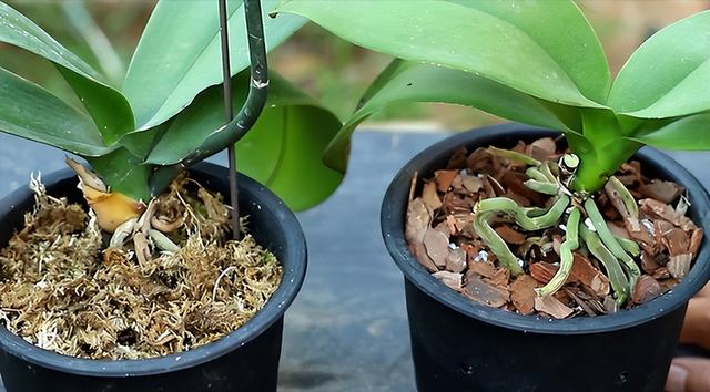2、精心准备材料 蝴蝶兰不同于其它植物,其根是一种典型的气生根,它不但可以吸收水分和营养,而且还可以进行光合和呼吸,所以,我们在种植植物时,要按照它的功能来进行适当的种植; 一般情况下,蝴蝶兰的根部都会有水藻,但最近一段时间,水藻的保湿能力很强,但却会影响到它的呼吸,所以,也有花友尝试着在盆栽里加点“树皮”,增加它的透气性,效果很好。 由于相对于纯水苔的植物,树皮可以大幅度减少烂根、茎腐病的发生,即便是夏天,也可以迅速蒸发其中的水汽,防止积水烂根,所以在配置植物时,推荐使用水苔、树皮等软质植物,并露出一部分根系,以确保正常的呼吸;