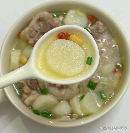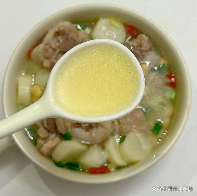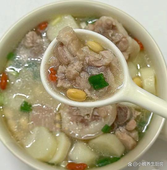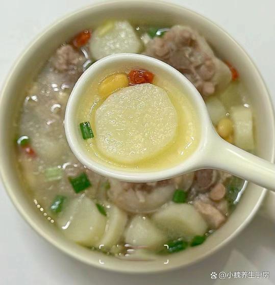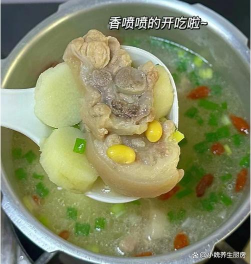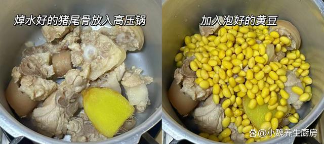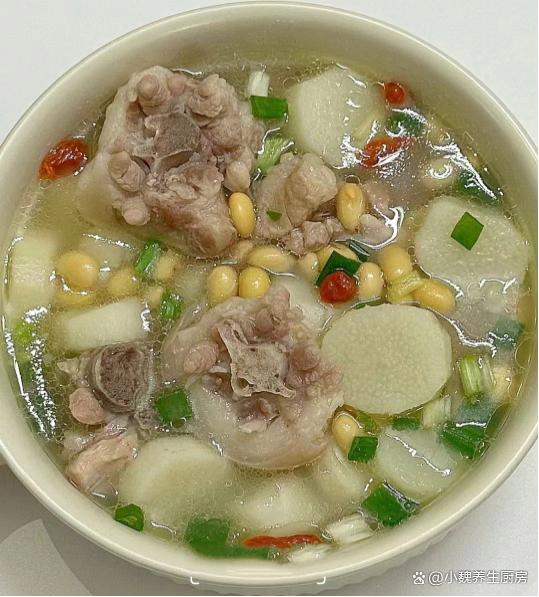 6:最后放入一些山药块,等到山药炖至熟透,加上鸡精半勺,食盐和胡椒粉各一勺,丢入洗净的枸杞子和香葱即可,这款黄豆山药炖猪尾骨汤就能够食用了。 黄豆山药炖猪尾骨汤是一款温补的汤品,广东人每个月都爱喝,汤品喝起来特别鲜美,滋补气血,调理我们的身体,润燥去火,内行人经常喝它。 黄豆和它是绝配,滋补养生,为身体补充元气,好处多多。你们是否掌握这款黄豆山药炖猪尾骨汤的烹饪方法吗?(文中的配图全部出自网络)
