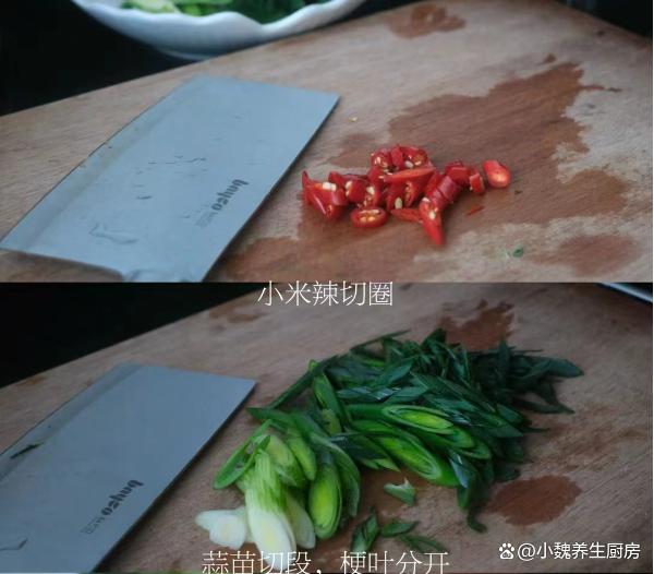 详细制作顺序:第一步:提前选购好蒜苗,酸萝卜和新鲜猪肉等食材,先把几个小米辣洗净,去蒂切成细段,大蒜头去皮切成蒜片,生姜切碎成细末,备用。