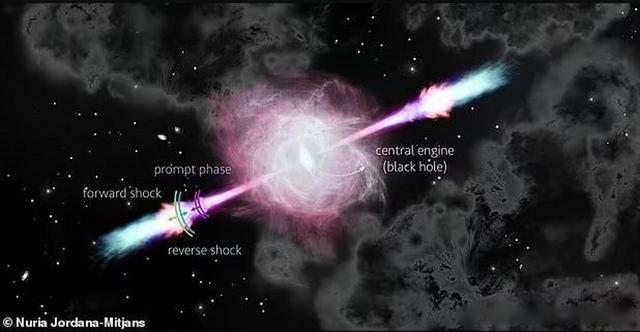 在遥远的19亿光年外,一颗大质量恒星因核燃料耗尽而崩溃,它在自身的引力中坍缩,与此同时黑洞在恒星的心脏部位诞生,伽马射线则是最极端的短波。