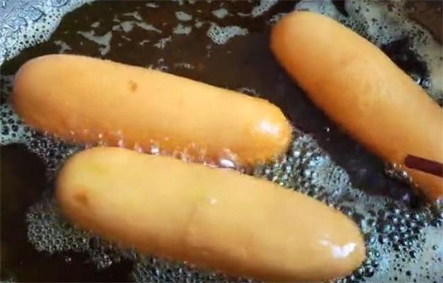 4.注意油温一定要稍微低一些,下锅微微温热就可以,小火慢炸,先不要翻面,炸至底面定型之后再翻面,炸至表皮金黄酥脆即可出锅,像这样没开裂的,就是下锅之后立即反复翻面的。