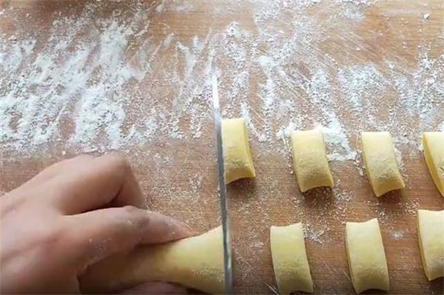 3.这一步我们不需要发面,直接放在案板上继续揉搓至光滑,然后搓成长条,像这样把它切成小段,尽量把这个体积做的小一些,这样孩子吃起来更方便,而且更容易醒发。