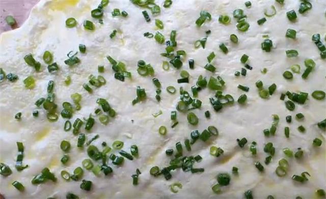 2.接下来醒好的面,我们手上和面上都涂抹一些油,防止粘连,案板上也要抹一些油,不用揉面,直接把面放在案板上,然后用手推成大薄片,均匀的涂抹上一层油,撒上葱花和盐,然后卷起来就可以,这个时候的面皮不要推的太薄,因为我们后期还要再次把它擀开,太薄的话层次就没有了。