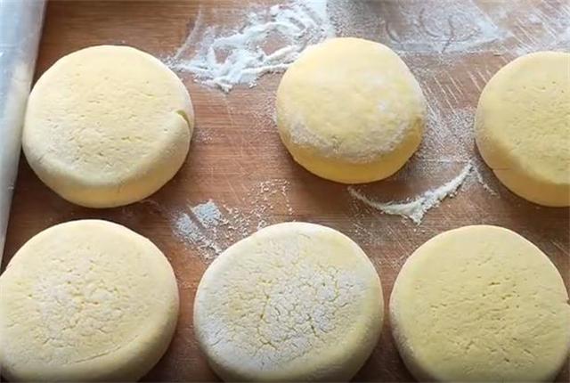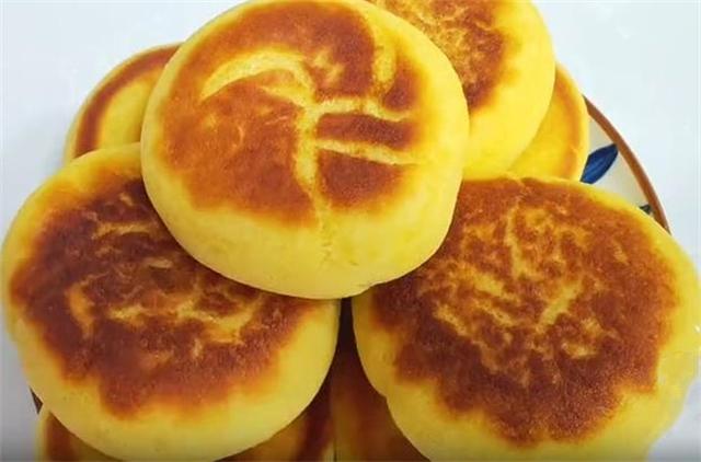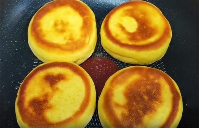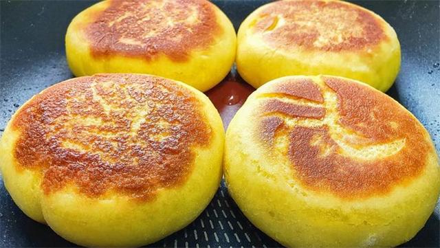 5.小火下锅,盖上盖子焖一分钟左右,一定要用最小的火,底面金黄的时候我们开盖翻面,这个时候如果饼子比较厚的话,可以淋少许的清水,盖上盖子再焖一分钟左右,注意一定是全程小火,大火的话表面容易糊。
