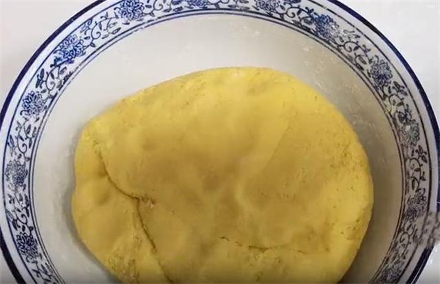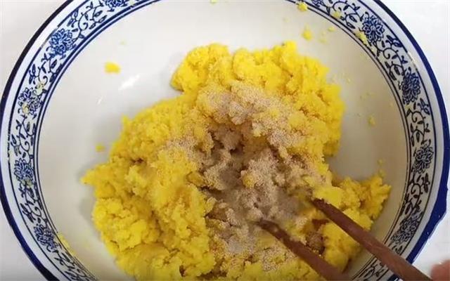 2.晾至玉米面温热的时候,加入四克酵母,也可以放少许的白糖促进发酵,搅拌均匀之后,分次加150到200克左右的面粉,最后我们把它揉成一个柔软的面团,然后醒发至两倍大。