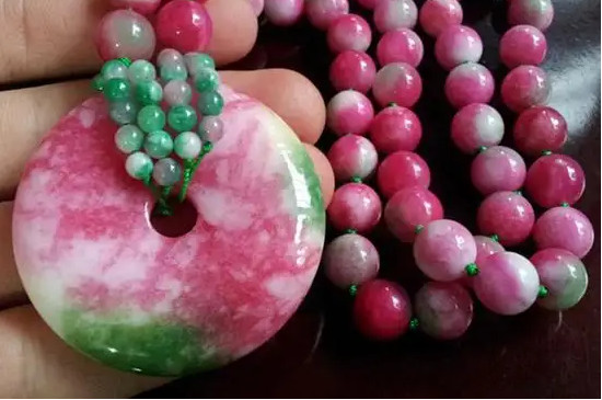 粉色的玉石是芙蓉玉,又称冰花芙蓉玉。整体为淡粉色,质感温润通透,内部含有云状白色花纹,在佩戴时会依据佩戴者的体质不同而变成粉色或者紫罗兰的颜色。芙蓉玉是蓝田玉的一种,寓意着永远的爱情,自身的价值不高。 3、红纹石