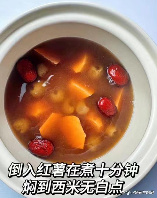 进入暖春3月份,春天要经历几个阶段,春天已经迈入暖和和的天气,气温开始升高,这个时候气血亏损,一整天都没有力气,出现贫血的症状,脸色会越来越差。人只要上了45岁,气血不足,手脚出现冰凉,脸色会长满色斑,这个时候适当的进补很重要。提到为女性补血,很多人只知道红枣和阿胶,如果出现贫血的情况,可以给女性多喝这款甜汤——红薯桂圆西米露,非常适合早餐和晚餐吃,补血效果很出色。春天,女性要多喝“它”,简单煮一锅,补血养颜,肌肤红润显年轻。  【红薯桂圆西米露的具体做法】 选购一些食材:挑选新鲜红薯几个(红薯又叫甜薯,是一种营养丰富,口感非常甜美的食材,称为餐桌上常见的食物,直接蒸着吃可以当成煮熟,红薯的膳食纤维含量高,有助于肠道的蠕动,还能补充体能,煮着吃的食疗价值更高),红糖2块,冷水喝温开水少许,干桂圆50克左右(桂圆肉是新鲜桂圆经过特殊处理后的食材,是补血安神的药材,食药两用,女性朋友可以多吃它,煮粥或煲汤都很不错),西米露35克左右,4-5个大红枣,优质枸杞子一小把,冰糖几个,其他。 www.ws46.com 正确烹饪顺序: 步骤一:提前准备好红薯,桂圆肉,西米露和红枣等食材,先把几个红枣彻底洗净,挖掉红枣的果核,也可以切成块,放在碗中备用。步骤二:干桂圆去掉核,用温水泡发半刻钟,清洗掉表面灰尘,枸杞子也提前洗干净,表面的灰尘都清理掉,这样吃起来更安心。步骤三:几个红薯去掉表面的泥土,用工具去掉一层外皮,去掉一些黑点,反复清洗干净,改刀切成滚刀块,备用。 步骤四:另外起锅,锅底清洗干净,锅中放入红枣和桂圆肉,加上两个红糖,加上800毫升冷水,盖上锅盖大火煮沸。