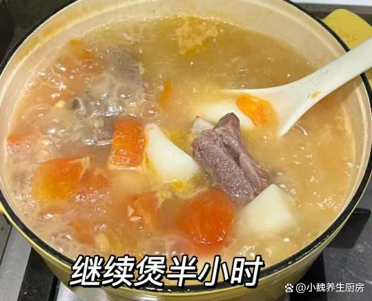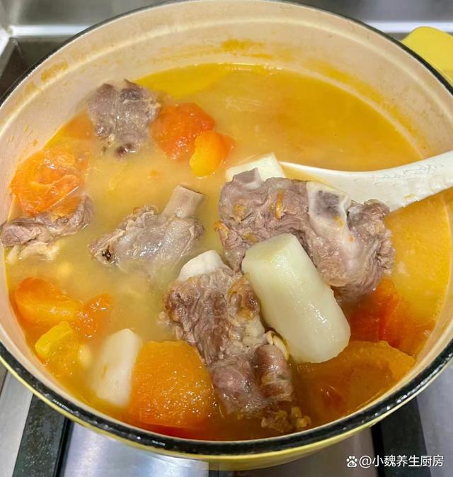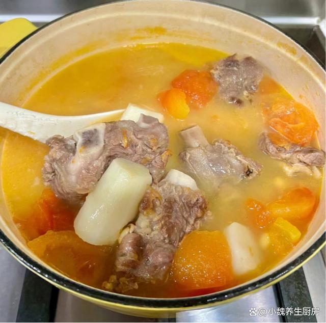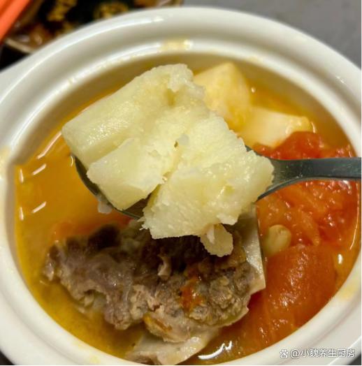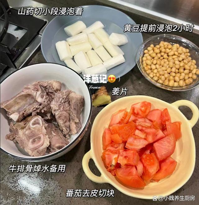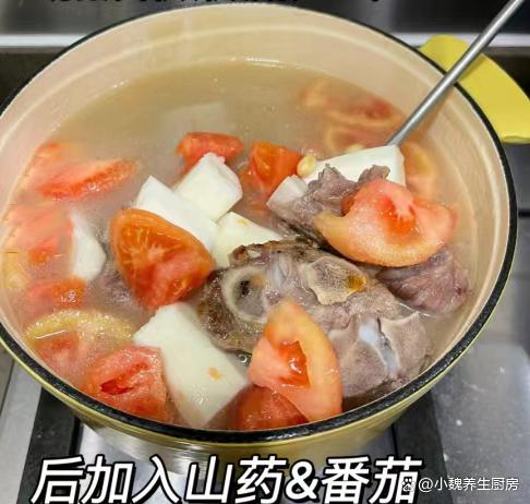 第六步:放入山药块和番茄,小火煲半个小时,让食材全部煮至软烂,出锅前加上食盐,调入半勺白胡椒粉,焖煮至入味即可,这款番茄山药牛排骨汤就制作完成了。番茄山药牛排骨汤的小贴士:首先,选择新鲜的食材非常重要。牛排骨应该是肉质鲜嫩、骨头带有一些骨髓的,这样煮出来的汤才会更加鲜美。山药要选择表皮光滑、无斑点、质地坚实的,这样的山药口感更好,也更有营养价值。番茄则要选择色泽鲜艳、果实饱满的,这样的番茄酸甜可口,可以为汤品增添更多的风味。 其次,煮汤的火候和时间也需要注意。一开始要用大火将牛排骨煮至变色,这样可以去除肉中的血水和腥味。然后转小火慢慢炖煮,让牛排骨的营养和鲜味充分渗透到汤中。在炖煮的过程中,要注意火候的控制,避免汤煮得太快导致营养流失,也要避免煮得太慢影响口感。另外,番茄的加入时间也很关键。一般来说,在汤快炖好的时候再加入番茄,这样可以保持番茄的鲜美口感和营养价值,同时也不会让汤变得过于酸涩。 最后,调味也是制作番茄山药牛排骨汤的重要步骤。在汤快炖好的时候,可以适量加入盐和胡椒粉进行调味,但是要注意不要加太多调料,以免影响汤品的原汁原味。 网友们,你们是否掌握这款番茄山药牛排骨汤的正确做法呢?(文中的配图全部出自网络)