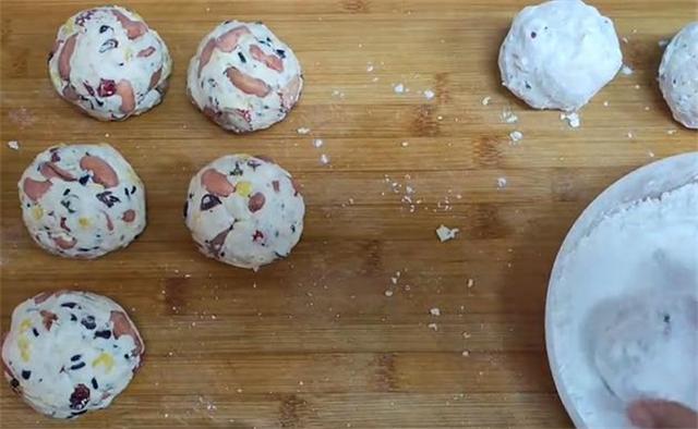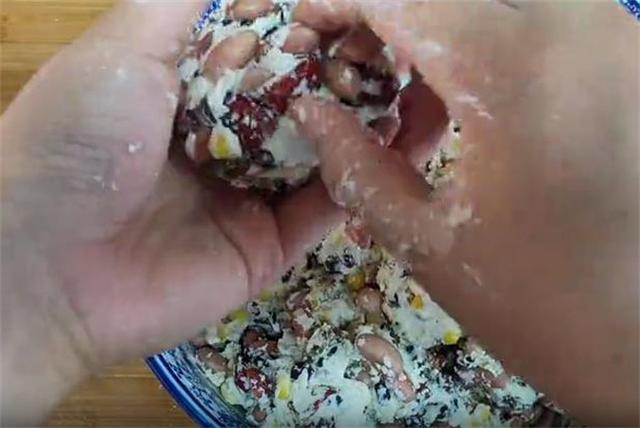 4.因为我们这所有的杂粮都是生的,所以团要攥得小一些,这样更容易蒸透。团好以后,我们准备一盆干淀粉,像这样把杂粮包的表层裹上一层淀粉,这样口感更筋道,而且冷冻的时候更容易拿取,而且能够锁住内部的水分,防止长时间冷冻风干。