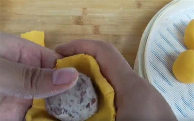 3.我今天做的是南瓜豆包,当然也可以不放南瓜,直接用开水烫面,南瓜捣成泥之后,趁热放入糯米粉,让南瓜的热度把糯米粉烫熟糊化,这样的面团会更软,更容易包制,包豆包的面一定要硬,不要软,因为如果这个面特别软的话,蒸的时候豆包就容易塌陷变形,而且口感不够劲道。