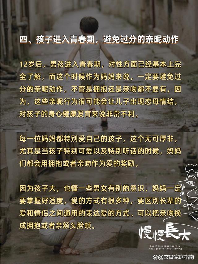 男孩和母亲之间关系,需要有一个逐渐退出和转换的过程。如果妈妈不注意,踩这几个“雷池”,儿子大了轻则缺乏边界感,重则会形成性格缺失。影响长大后的社交,找工作职场,甚至择偶结婚。 学会跟孩子沟通非常重要,我的孩子也遇到过同样的问题,当时也是非常的着急上火,在了解到高途美好家庭后,学会了怎样有用的沟通,处理了孩子问题的同时,更孩子的关系也更加亲近,对孩子也更加了解。 儿大避母,女大避父这是我国的一句古话,也是中华文明的延续。国情的不同,我们不能像西方人一样表达对后代的爱。有时候他们的举动也只是习俗,我们不要模仿,更不要过分夸大。 - 表达爱有很多种方式,孩子大了以后, 学会退出孩子的世界,这种交接不需要仪式,但是需要果断!不一定夸张的肢体接触才是爱,母爱的蔓延更是一种温暖和长远的力量。
