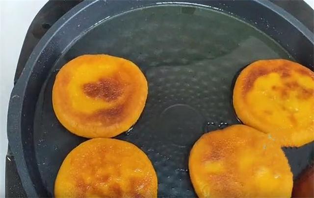 5.锅中加油,全程一定要用最小火慢煎,煎至底面微黄翻面,然后继续小火反复翻面,这样能够使表皮定型变硬,出锅之后即使变软了,表皮也不会粘连,全程大概煮4到5分钟就可以出锅。