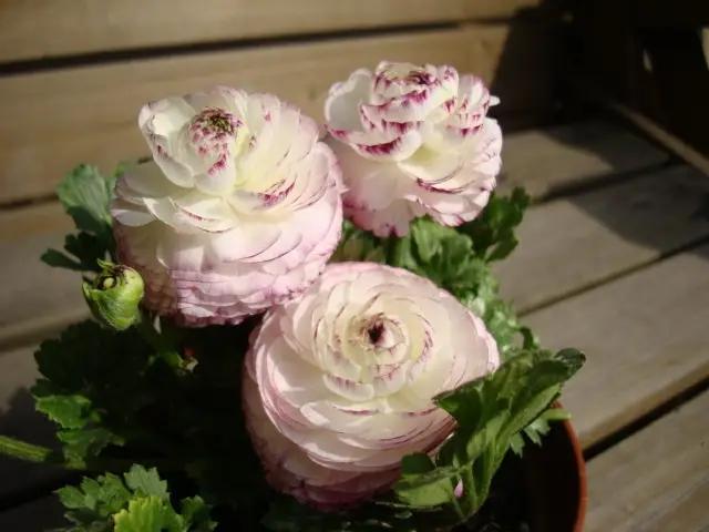 ⑥花毛茛 毛茛花类似于牡丹花,花瓣厚实浓密,花型优美,造型典雅,虽不及牡丹那般艳丽,但也极易种植。 不管是养在花坛,还是养在盆中,都是一道靓丽的风景线,只要掐准时机,把窗子拉开,就是一大片花海,美不胜收。 毛茛种球很有意思,看一眼就再也忘不掉,养在阳台阴处比较好,由于它不喜直射阳光,而是喜散射光,因此养护时要避免积水。
