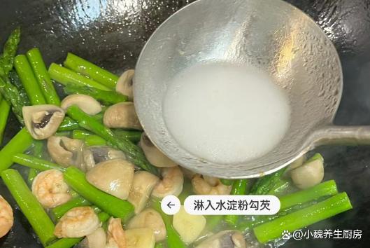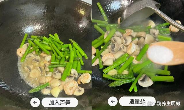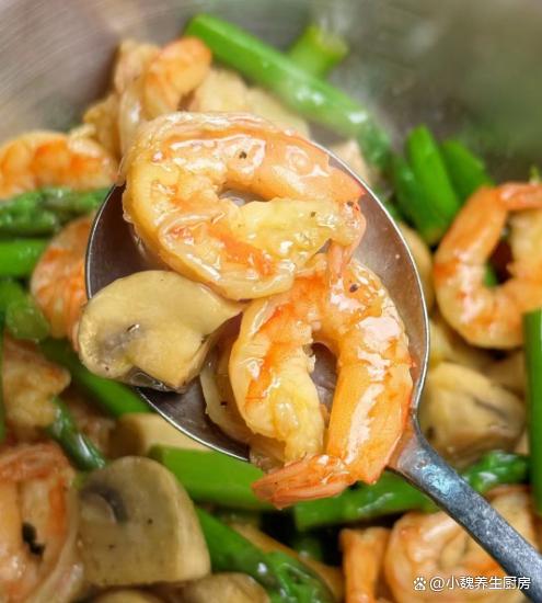 第六步:放入一些蒜末和姜末,倒入口蘑炒至变软,最后倒入焯水好的芦笋,加上适量食盐和白糖,加上鸡精半勺。 第七步:最后加上生抽和蚝油,加上少许水淀粉勾芡,大火收汁,这道芦笋虾仁炒口蘑就制作完成了。 芦笋虾仁炒口蘑的小贴士: (www.Ws46.com) 首先,选用新鲜的食材是制作这道菜的关键。芦笋应该选择鲜嫩、颜色鲜绿的,口蘑则应该挑选肉质厚实、表面光滑的。虾仁则应该选用肉质饱满、无异味的。新鲜的食材不仅能保证菜肴的口感,还能让我们更好地品味到食材本身的美味。其次,在烹制过程中,火候的掌握也至关重要。一般来说,这道菜需要用中火快速翻炒,以保持食材的嫩度和口感。同时,要注意不要炒得过久,以免影响食材的营养和口感。此外,调料的搭配也是制作这道菜的重要一环。可以使用适量的盐、胡椒粉、料酒等调味料来提升菜肴的口感。同时,根据个人口味,还可以适量加入一些鸡精、味精等调味品。 最后,小贴士还包括一些细节方面的处理。比如,在炒制前,可以先将芦笋和口蘑焯水一下,以去除其中的杂质和异味。另外,在炒制过程中,可以适量加入一些清水或高汤,以增加菜肴的汤汁和口感。 你们是否掌握这道芦笋虾仁炒口蘑吗?(上述文中配图都出自网络)