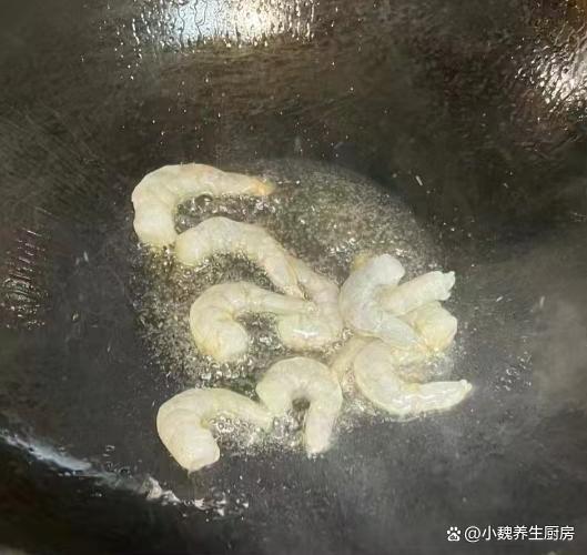 第五步:锅中提前烧热乎,加上食用油少许,倒入虾仁煎一会儿,加上半勺料酒去腥,让虾仁变色。