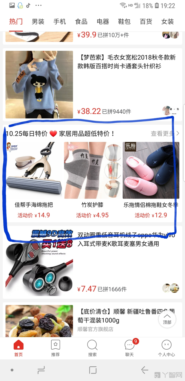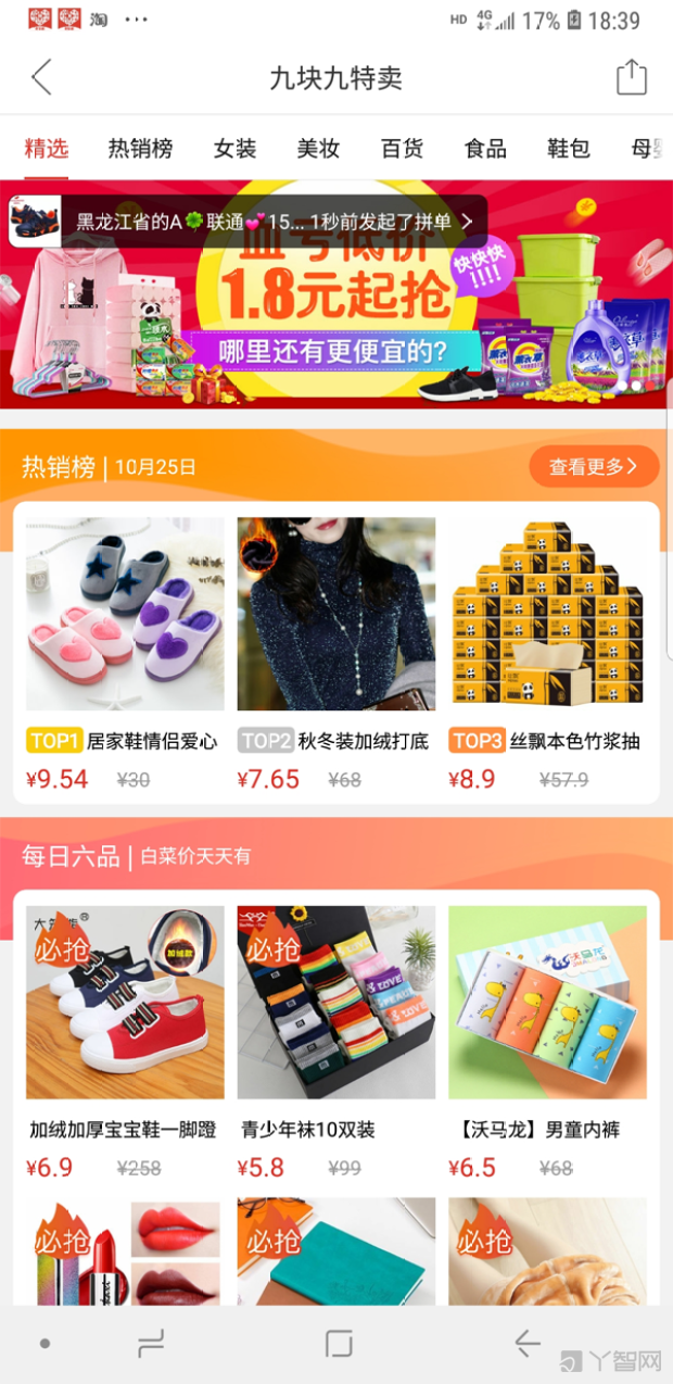 9块9是除秒杀频道外,流量最大的频道之一,商品审核通过都能获得相同量的曝光再进行考核,如果点击率、转化率、曝 光产出等综合表现胜出,则能晋级到更大的流量池,得到更多的流量曝光。