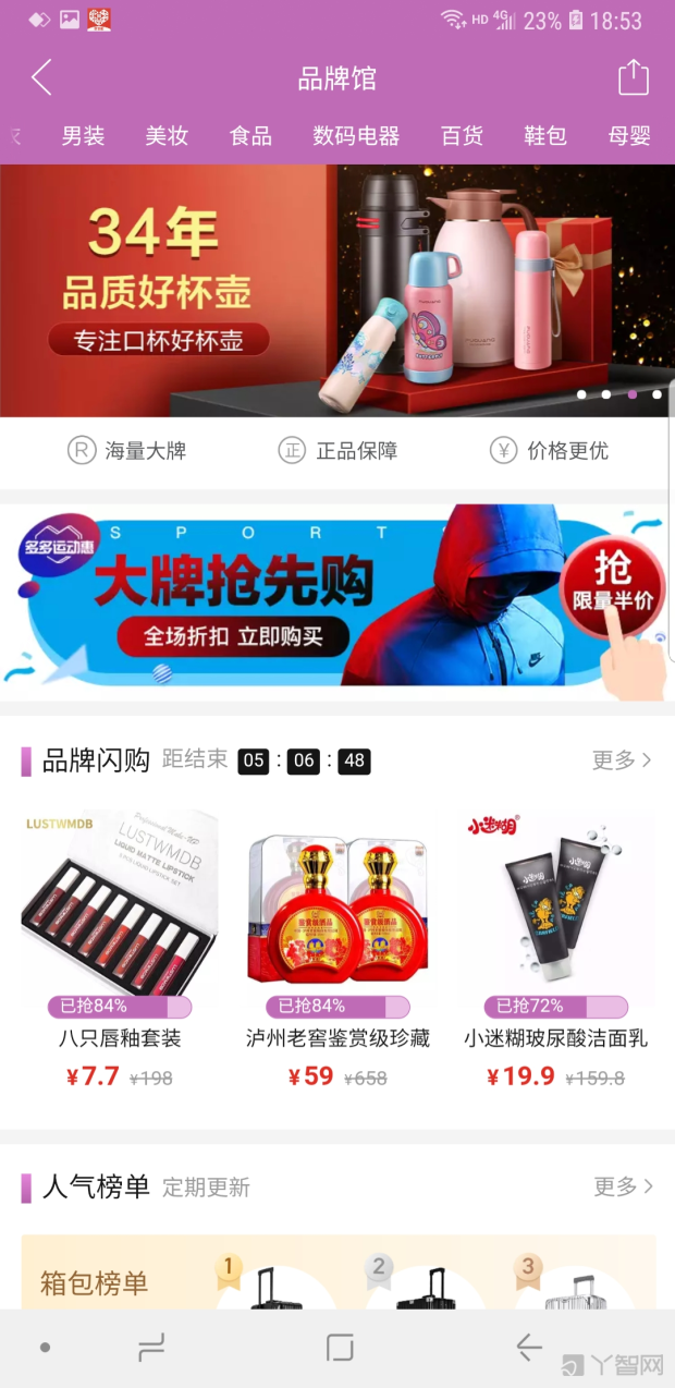 (7)品牌馆:品牌闪购、人气榜单、精选推荐、首页横条