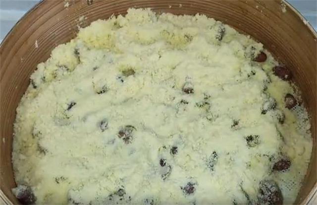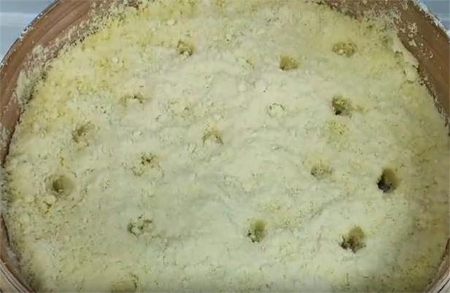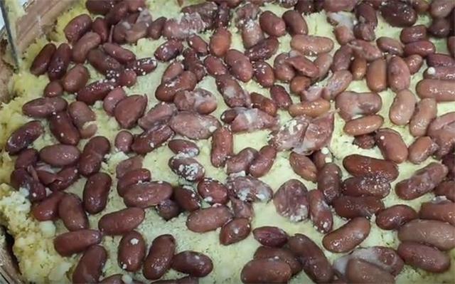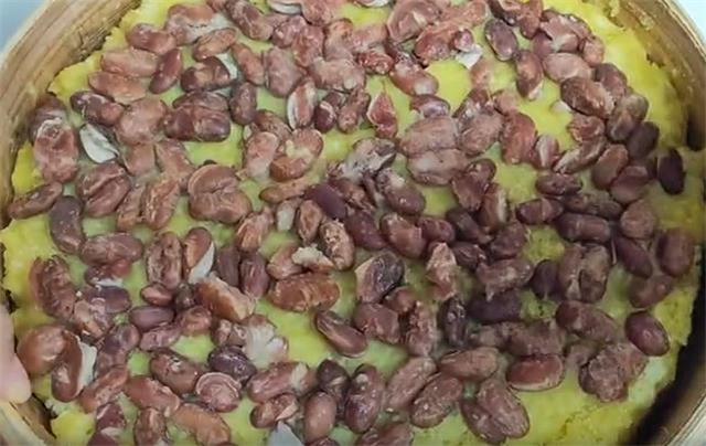 7.在盖盖子之前,我们再戳几个洞,撒上一层豆子,然后大火焖35到40分钟左右即可。这个时候如果你锅内的水比较少的话,建议准备一壶开水,可以往里边续加。当然如果是第一次做的话,建议不要撒的太厚,稍微薄一点口感是一样的,出锅以后把它摞在一起也是有厚度的。