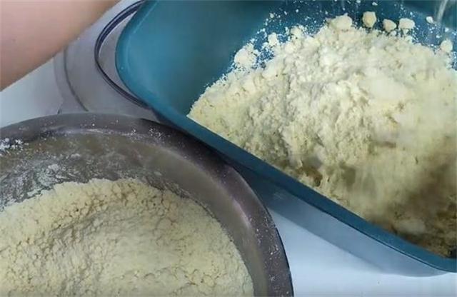 2.加水以后会有很多的小颗粒,我们可以过筛,或者是用料理机把它打细腻,粉的越细腻无颗粒,年糕就会越筋道,不会夹生。