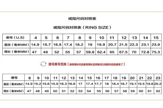 1、戒指美码和中国码对照表中国的戒指尺码大多采用港版尺码,美版戒指尺码与港版戒指尺码比会偏大些,在对照戒指尺码前先测量出手指最宽处的周长,对照美码和国码戒指一般用于代购或外国品牌戒指,很多国家在出售戒指时采用美版戒指尺码。当手掌最宽处的周长为47毫米时,戒指的直径在14.9毫米,应选择港版8号戒指,对应美号的4号戒指尺码。 当手指最宽处的周长为49毫米,戒指直径在15.6-15.7毫米之间时,应选择港版10号戒指尺寸,对应的是美版5号戒指。当手指最宽处周长在55毫米时,应选择戒指直径在17.4-17.7毫米的港版16号戒指,对应美版7号戒指。港版13号戒指对应美版6号。 2、怎么量指围确认戒指尺寸量指围尺寸一般可使用戒指尺寸棒、细绳、软尺或旧戒指进行测量,商家测量顾客的手指时,一般会选择戒指尺寸棒,先选择合适的戒指尺寸,将戒指放在戒指尺棒上测量,尺寸邦德的数值就是戒指的尺寸。若在家自行测量,可以选择细线测量法,将细线围绕手指一圈,在重合处做好标记,再测量重合处的长度即可。 3、宝格丽戒指对应中国尺码不同品牌的价值尺码不同,宝格丽珠宝是原产于意大利的品牌,使用欧洲的戒指尺寸标准,在购买宝格丽戒指时,需要进行对应中国尺码。宝格丽戒指尺码一般在44-70号,而中国版尺码在8-23号之间,国版戒指尺码在7号时,对应欧洲尺码57号。 |