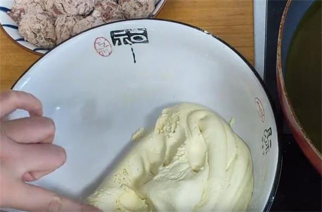 4.手上沾一些油,防止粘手,取一块面团按扁包入馅料,豆沙,糖都可以,团圆之后再次按扁。