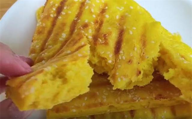 5.最后关火再焖一分钟,能够保证里面熟透,饼子表皮金黄鼓起即可出锅,切成小块即可食用。
