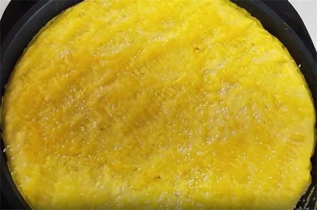 4.然后油温微热倒入面糊摊平,记住一定要全程用小火,摊平之后我们关火停一分钟左右,这样让面糊更好的启发,然后撒上芝麻,淋上油,再开最小火盖上盖子焖四分钟左右。