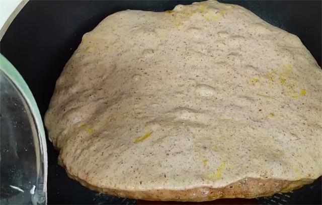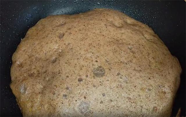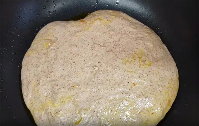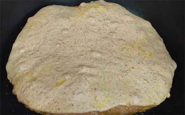 3.锅内放少许的油,把面糊倒入锅内再醒发5到10分钟,当然如果夏季温度高的话,也可以不醒发,稍微整理一下形状,盖上盖子。