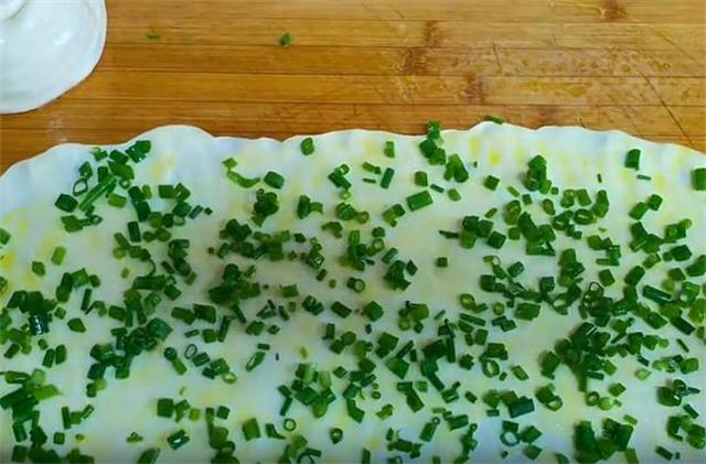 2.早起的时候案板上抹一些油,防止粘连,然后把其中一个面剂用手推开,因为醒发一宿,所以很容易推开,均匀的涂抹上一层油,撒上葱花,再撒上一点点的盐,调一个底味。