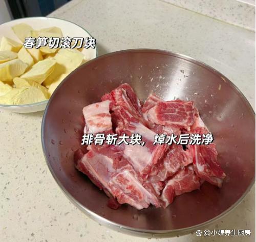 进入三月,春回大地,我们能够感觉到气温升高了,万物开始复苏了,生机勃勃,绿草如茵,花儿都争相开放,大自然的景色实在是太美丽了,空气非常清新,因此春季适合出门游玩,也非常适合养生。春季是一年的开始,想要一整年过得安稳,需要给身体进补,不要总吃大鱼大肉,平常要多喝一些鲜美的汤品,比如说这款春笋排骨汤,春笋是春季的应季菜,农村的山里到处都是,我们家天天吃,城里人吃不到,用来煲汤非常不错。许多人没有喝过这款春笋排骨汤,到底应该如何制作呢?赶快收藏起来吧。春季,不喝这汤就亏了!3月要多喝这汤,补足营养,安稳度过春天。  【春笋排骨汤的正确做法】 食材明细:选购新鲜春笋300克左右(春笋是竹笋的品种之一,春笋是初春上市的时令蔬菜,春笋以野生为主,是大自然给人类的礼物,吃起来扣鲜美,可以炒,煮和炖着吃,春笋搭配排骨煲汤是绝配,补充许多营养,促进营养的消化,春季吃它正当季 ),选购250克新鲜排骨(排骨是猪骨的种类之一,食用方法更多一些,许多南方人拿来煲汤,让汤品特别鲜美,肉质也鲜嫩不柴),生姜一大块,香葱若干根,若干料酒,冷水和温开水若干,食盐少许,胡椒粉少许,枸杞子8克(没有可以不加),其他。 正确制作步骤: 第一步:提前选购好新鲜春笋,排骨和其他食材,先把一些生姜刮掉皮,洗净切成若干片状,香葱洗净切成葱段,另外一部分打成葱结,备用。第二步:把春笋的叶鞘剥掉一部分,切掉一些老的部分,反复清洗干净,改刀切成滚刀块,放在碗中备用。第三步:让商贩将排骨剁成若干小块,用冷水浸泡半个小时,中途多换几次水,冲洗掉血水,备用。 第四步:另外起锅,锅中放入洗净的排骨,丢入葱结和姜片,加上冷水和料酒,一定要冷水下锅焯烫去腥,逼出里面的血腥物质,然后用温水冲洗干净,准备好春笋和排骨,开始烹饪这道春笋排骨汤。 第五步:准备好砂锅一个,锅底加上少许油,倒入排骨煸炒几下,表皮微微焦黄,关火,放入春笋块和温开水,水要没过全部食材。