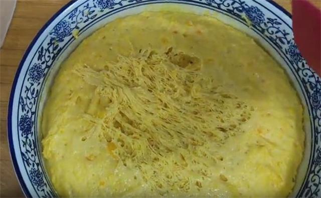2.温热的时候加入酵母粉,再加一点小苏打搅匀晾凉,因为我们是要醒发一夜,防止它有酸味,所以最好是等这个南瓜汁液凉了之后再下面粉,这样它发酵的速度能够慢一些,凉了之后加入面粉搅成干面糊的状态,然后盖上保鲜膜放冰箱冷藏。