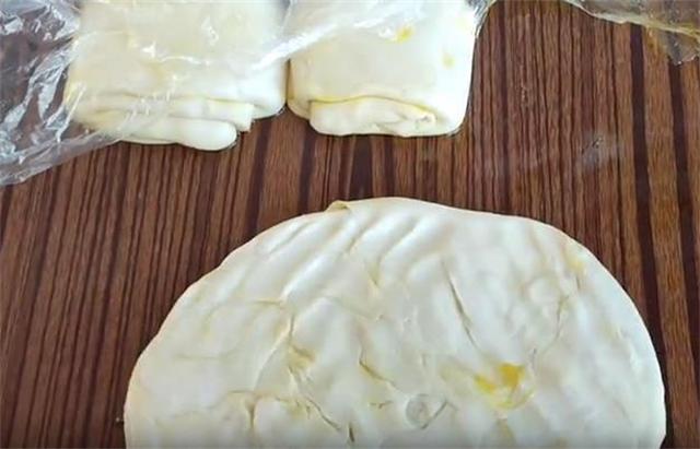 4.然后把面剂用手把它摊开,均匀的涂抹油酥,非常简单,上下折叠之后稍微抻一下,然后把它折叠卷起来就可以,这样生坯就做好了,然后盖上保鲜膜二次醒面,这个非常的重要,一定要经过二次醒面,这样烙出的饼才会柔软,第二次醒面剂,时间大概10分钟左右。