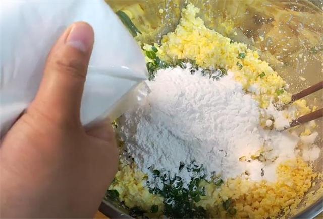 2.这是擦好的玉米浆,大概是八根玉米,然后我们加盐和味精,一定要加的就是这个小葱花,特别的提味,可以少许的加一点面粉,如果有糯米粉的话,最好是加糯米粉。