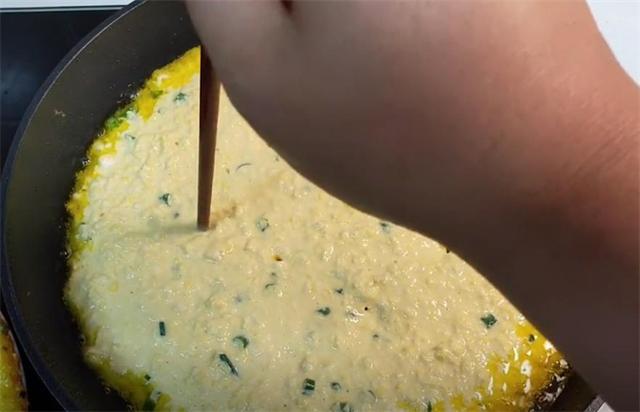 4.平底锅烧油,油热开最小火倒入面糊,然后中间像这样用筷子戳几个洞,方便排气,盖上盖子,最小火焖3到5分钟左右,就是你闻到玉米的香味就可以开盖了。