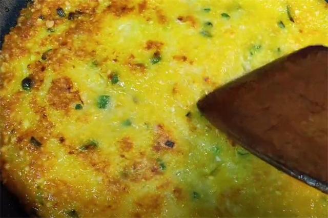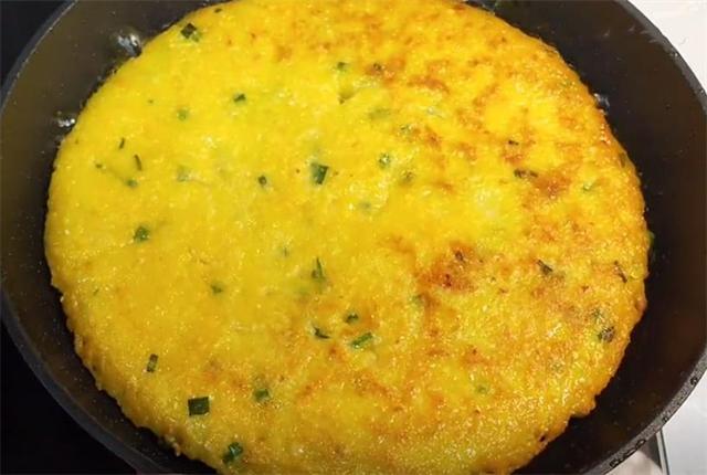 6.因为擦的这个玉米颗粒有的比较大,所以时间一定要长一点,保证里面熟透,烙到表皮像这样微焦就可以出锅了。