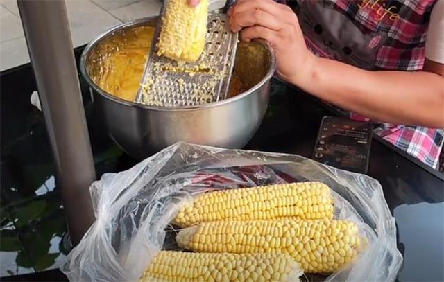 1.如果你还没吃过这个饼,强烈建议你做一次,真的是绝绝子,超好吃。原材料就是鲜玉米,选稍微老一些的,但也不要太老,像这样用擦板把玉米浆擦出来,这个绝对是一个体力活。