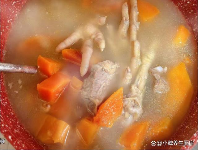 进入阳春三月,从凉爽的天气,转变到暖和和的大晴天,经历过寒冬以后,草木丛生,百鸟齐鸣,百花齐放,万物都呈现复苏的景象,感觉到大自然的美景。春季是一年的开始,气温很温和,但是容易出现燥热,肝火旺盛的情况,这个时候要调整好饮食,别忘记多喝汤。春季是进补的“首选”,平常可以给家里人尝尝这款鲜汤——木瓜花生眉豆鸡脚汤,汤色乳白,鲜美极了,女性朋友要常喝它。春季忘喝汤,一年都白忙!3月要多喝这汤,补足营养,增强免疫力。  【木瓜花生眉豆鸡脚汤的具体做法】 准备一些食材:选购新鲜木瓜150克左右(木瓜又叫番木瓜,是非常受女性朋友喜欢的水果,富含木瓜酶、维生素C和氨基酸等物质,多吃木瓜能够美容养颜,还可以加速肠道蠕动,促进新陈代谢),选购鸡脚200克(鸡脚又叫凤爪,是日常生活中的常见食材,鸡爪富含大量蛋白质,可以烹饪成各种美食,可以卤,红烧或煲汤),选购半斤新鲜猪骨,几个蜜枣,眉豆50克左右,优质花生米一小把,冷水和温水少许,生姜一大块,大葱一小段,料酒若干,少许白胡椒粉,食盐若干,其他。 详细做法: 1:提前选购好眉豆,花生,木瓜和鸡脚等食材,先把鸡脚拿出来解冻,去掉脚趾尖,用清水浸泡一会儿,洗净控干表面的水分。2:先把猪骨剁成一些小块,全部放在容器里,用冷水浸泡一个小时,反复冲洗几次,逼出里面的血水,洗净控干表面水分即可。 3:提前把木瓜削掉外皮,从中间对半切开,挖掉一些瓜瓤,反复清洗干净,然后切成若干块状,放在碗中备用。4:花生米提包费温水泡发,眉豆用清水洗干净,提前泡发至变软,几个蜜枣洗净去核,生姜切成片状,大葱也切成片状,备用。 5:另外起锅,锅中放入鸡脚和猪骨,加上足量的冷水,放入葱段和姜片,多加一些冷水没过全部食材,调到大火炖煮几分钟,去掉一层浮沫,捞出备用。