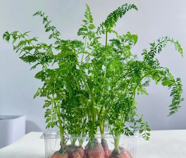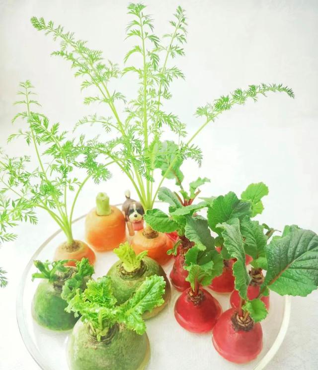 胡萝卜是炒菜中的经典配餐,有了它的存在,不仅色彩丰富鲜艳,能提升食欲,提供丰富的维生素A,健康助力。 而吃剩下的胡萝卜根,平放在有水的托盘里,不久后,便会冒出一个个嫩绿的叶片,又精致又高级,满满的治愈感。 而除了胡萝卜之外,什么白萝卜绿萝卜红萝卜等等,都可以放在一个托盘上,在阳光的滋养下,会慢慢的绽放升级,形成一个个独特的小盆栽。