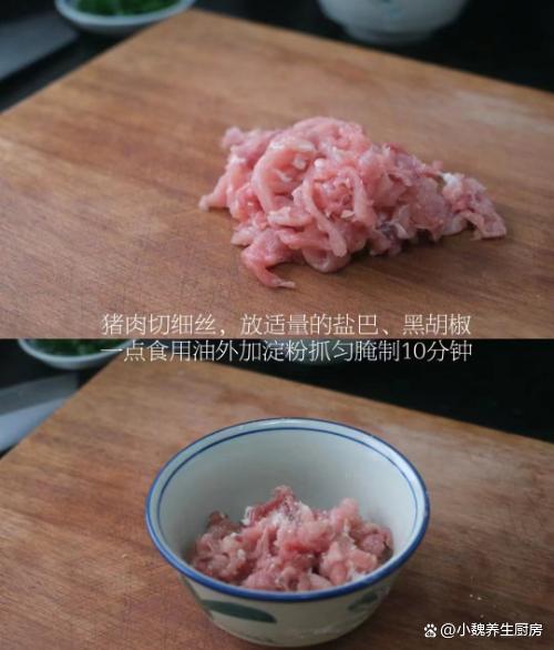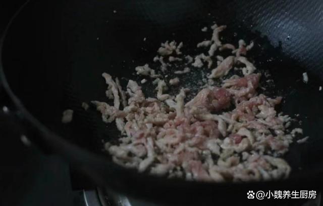 (www.ws46.coM) 4:锅底调入少许食用油,让油温慢慢烧热乎,滑入腌制好的瘦肉丝,迅速煸炒至变色,加上半勺料酒和生抽,迅速翻炒均匀。