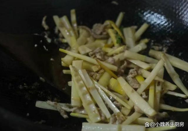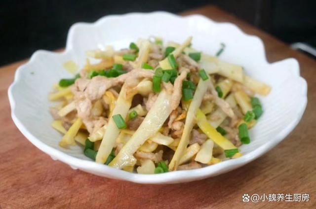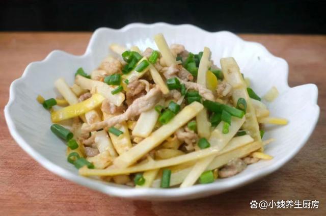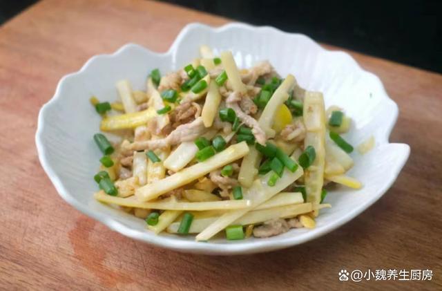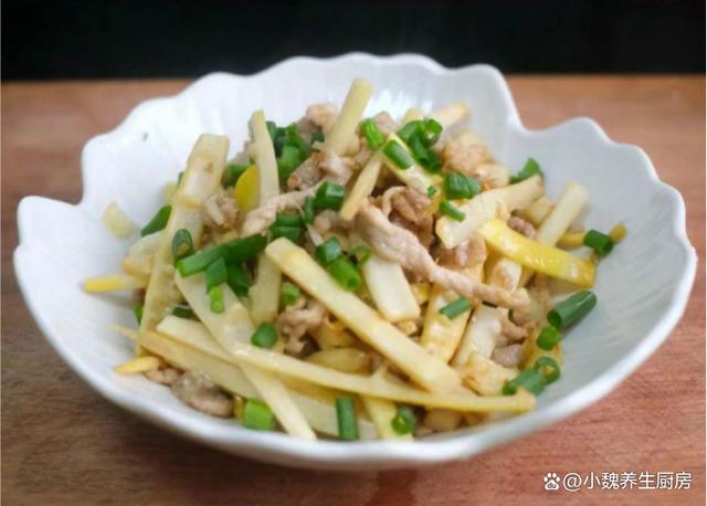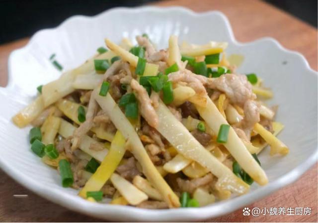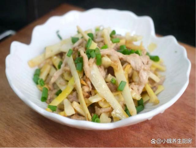 5:倒入焯水好的雷笋,将其爆炒至断生,放入一些青椒丝配色,加上葱段,加上生抽和蚝油,加上一丢丢食盐和其他佐料,快速翻炒几下,这道雷笋炒肉丝就制作完成了。 雷笋炒肉丝是一道春季时令菜,现在正是雷笋上市的日子,口感是最鲜嫩,搭配猪肉是绝配,鲜嫩美味,荤素搭配,肉丝非常鲜嫩,解馋开胃,吃起来特别下饭,还可以清理肠道的毒素,养肝护肝,让身体更加健康。 网友们,你们是否吃过这道雷笋炒肉丝呢?(文中的配图都出自网络)