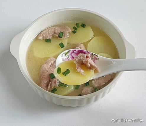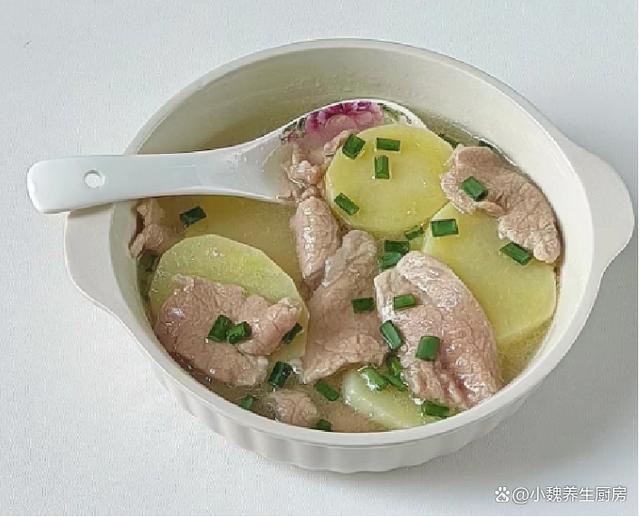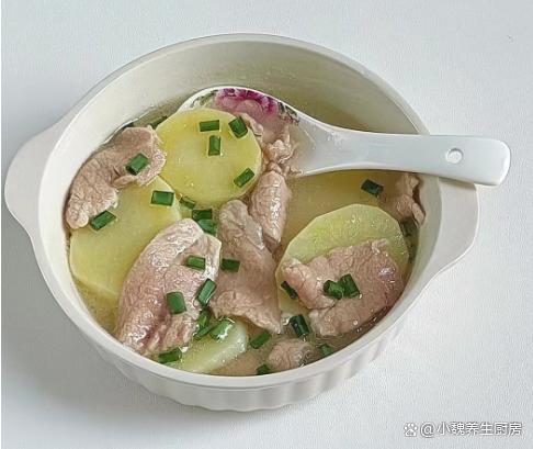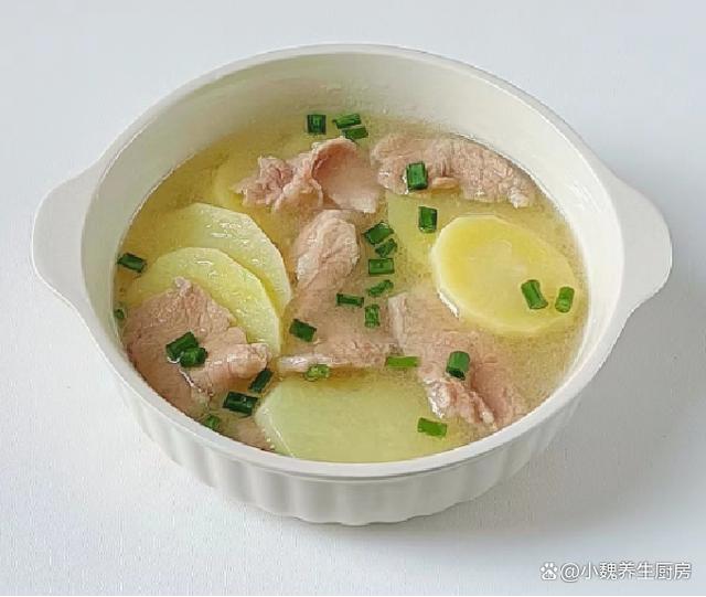 步骤6:加上适量温开水,下入腌制好的瘦肉片,让瘦肉片烫至变色,加上半勺味极鲜,加上食盐和胡椒粉调味,最后丢入一些葱花点缀,这款土豆片滑肉汤就制作完成了。 土豆片滑肉汤是一款简单易学的汤品,主要选用土豆和猪肉制作而成,简直是天生一对,肉片特别鲜嫩,汤品特别清淡,为身体储备一些能量,今年春季过得安稳。 网友们,你们是否掌握这款土豆片滑肉汤的正确做法吗?(上述配图都出自网络)