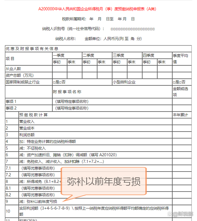 根据《国家税务总局关于填报企业所得税月(季)度预缴纳税申报表有关问题的通知》(国税函2008年635号)规定,纳税人企业按实际利润额预缴企业所得税,实际利润额填报按照会计制度核算的利润总额减除以前年度待弥补亏损以及不征税收入、免税收入后的余额。(www.Ws46.com) 从《A200000中华人民共和国企业所得税月(季)度预缴纳税申报表(A类)》中可以看出,第9行有“减:弥补以前年度亏损”项目,需要注意企业所得税弥补以前年度亏损的时间限制。