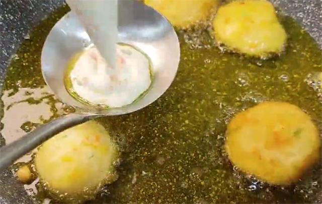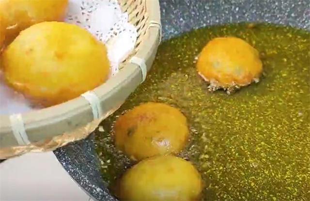 6.全程要保持小火,防止外皮炸糊,里面还没熟,炸到表皮微黄变硬就可以出锅。