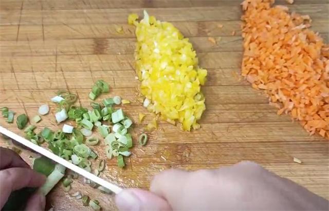 1.把自己喜欢吃的蔬菜切成小丁,我准备了胡萝卜、青椒、还有葱。