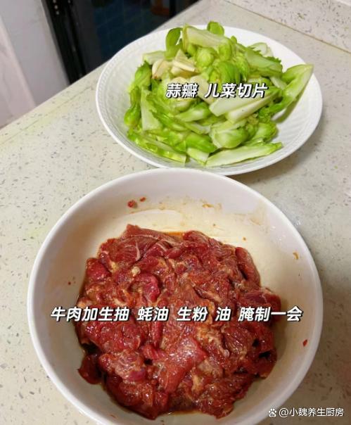 时间过得如此的快,前些日子还沉醉在春节假期,一晃眼就过完了,与家人团聚的日子很短暂,收拾好行李回家,准备开始今年的工作。上班的第一天非常轻松,这几天刚好是大晴天,感觉到春天的到来,给人很温暖的感觉,但是我们也需要许多营养,才能健康度过春天。春季是不错的进补时期,尤其是家里有孩子,孩子是家里的未来,需要大量的营养,帮助孩子长身体。春季到了以后,可以少吃萝卜和白菜,但是一定别忘记吃肉,尤其是牛肉,虽然价格贵一些,肉质鲜嫩,搭配儿菜是绝配,营养易消化,总吃不腻。春季到了,无论贫富,常给家人吃这菜,荤素搭配,错过太可惜了。  【儿菜炒嫩牛肉的食谱解析】 准备一些食材:选购新鲜儿菜320克(儿菜又叫娃头菜,是芥菜的根茎部位,外皮为嫩绿色,吃起来清脆可口,营养价值很丰富,钙含量很高,家里有孩子的家庭,一定要常吃这菜,搭配肉类是绝配),选购半斤牛肉里脊(牛肉是我们家常吃的肉类,比猪肉贵一些,蛋白质和铁元素含量高,春季进补要经常吃它),辅食油和食用油少许,冷水少许,半勺蚝油,一勺愿望生抽,鸡精和食盐,2片老姜,生粉少许,其他佐料。 具体制作顺序: 1:提前准备好新鲜儿菜,嫩牛肉和其他配菜,先把一些大蒜头去掉外皮,洗净切成若干蒜片,2片生姜切成细丝,备用。 (www.ws46.com) 2:先把新鲜儿菜的根部切掉,去掉多余的部位,用清水冲洗干净,斜切成厚度相同的片状,可以用食盐腌制,或者烧一小锅热水,加上一些食盐,倒入儿菜焯烫一会儿,去掉涩味,让儿菜的口感更佳。3:先把嫩牛肉清洗几次,一定要逆着纹路切成片,这样不能破坏牛肉的纤维,牛肉片要尽量要薄一些,这样牛肉的口感更好。 4:切好的牛肉片搁在碗中,加上少许生抽和蚝油,放入一些生姜丝,加上生粉一勺,调入少许食盐腌制,滴入一些辅食油,锁住牛肉的水分,迅速抓拌至均匀,放置冰箱12分钟,准备好一些配菜和牛肉, 5:锅底慢慢预热,加上适量食用油和食盐,滑入提前腌制好的牛肉,一定要调到大火爆炒,等待牛肉炒至变色,盛出装盘。 6:锅底继续加上油,放入一些姜末和蒜片,快速爆炒出蒜香味,倒入焯水好的儿菜,爆炒至断生。 7:将炒好的牛肉回锅,加上生抽和蚝油半勺,加上鸡精,白糖和食盐等佐料,用锅铲快速煸炒几下,盛出装盘,开吃了。 儿菜炒嫩牛肉是一道美味的菜肴,儿菜是现在最嫩的蔬菜之一,搭配牛肉是绝配,肉质鲜嫩,儿菜吃起来清甜爽口,吃起来好吃不会腻,补充多种维生素和营养成分,调理我们的胃口,错过太可惜了。 网友们,你们是否掌握这道儿菜炒嫩牛肉的具体做法吗?(文中的配图都出自网络)