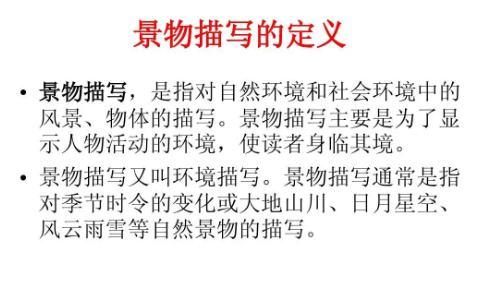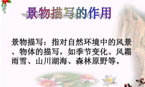 景物描写有什么作用 可以交代故事发生的时间、地点,揭示作品的时代背景;渲染气氛烘托人物心情;揭示人物心境;展示人物性格;推动情节的发展;借景抒情;情景交融;照应标题等。
