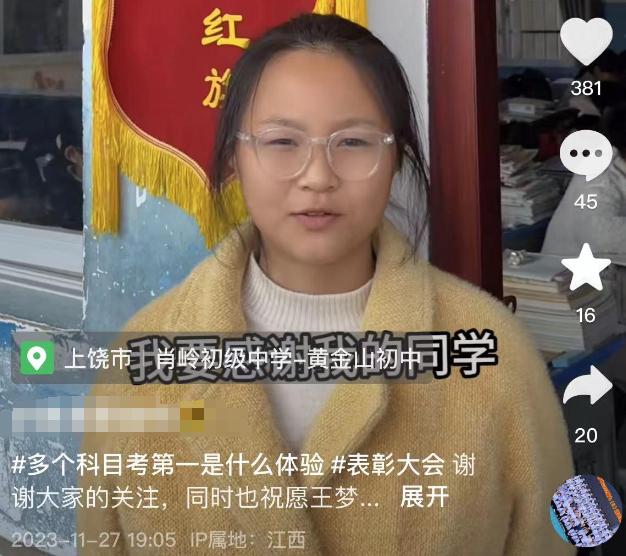 在江西上饶市的一所中学里,有一次表彰大会上,一个八年级的女生王梦惠成为了全场的焦点。这位优秀的学生代表,以卓越的学业成绩和多方面的才艺赢得了师生们的广泛赞誉。在颁奖典礼上,她一人连续获得九张奖状,这是对她辛勤努力和杰出表现的最好肯定。 她以出色的学业成绩成为了全校的学习楷模,每门功课都保持着优秀的成绩。不仅是老师们引以为傲的学生,也是同学们学习的榜样。