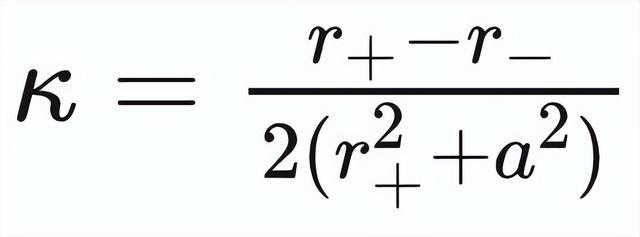 接下来介绍另一个重要的参量,黑洞的表面引力κ,它是一个物体静止在外视界时所感受到的引力场强。但事实上,物体无法静止在视界表面,因为它要求物体以光速运动。所以,我们让它静止在视界表面之上一丢丢。此时物体要跟随黑洞以同样的角速度转动,才能以视界相对静止。在这种条件下,我们可以得到表面引力: