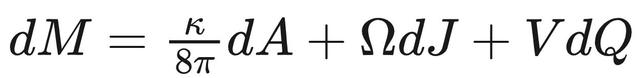 黑洞的热性质1971年,霍金在强能量的条件下,证明了黑洞的面积定理:在经典广义相对论中,一个孤立黑洞的表面积只能增加或保持不变,不能减少。按照这个定理,两个黑洞合并后,新黑洞的表面积要大于两个旧黑洞的表面积之和。 面积定理使贝肯斯坦意识到黑洞表面积具有类似于热力学第二定律的性质,即熵只能增加或保持不变、不能减少。经过进一步的思考,贝肯斯坦得出了黑洞各个参量的关系式。与此同时,斯马尔也独立得出了同样的公式。因此,该公式被称为贝肯斯坦-斯马尔公式,它的表达式为: