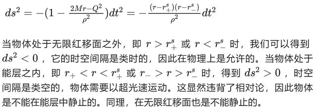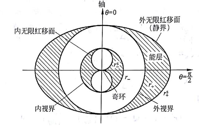 从上图两个式子我们可以看出,无限红移面和视界并不像我们所熟悉的史瓦西黑洞一样是重叠的。在无限红移面和视界之间,就是所谓的能层:外无限红移面和外视界之间是外能层,内无限红移面和内视界之间是内能层。此外,内外两个视界之间的区域是单向膜区,进入此区域的物体将不可避免向内部落去。